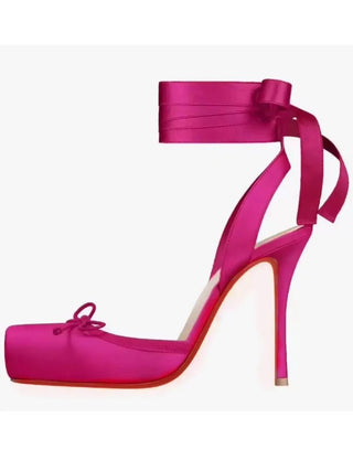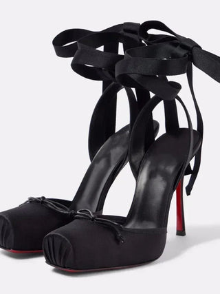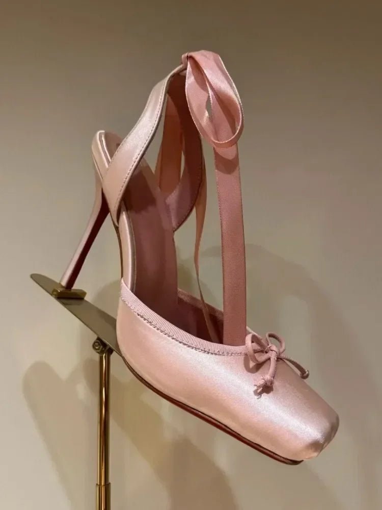 Design: Elegant square satin ankle strap sandals featuring a chic butterfly-knot detail and sleek lace-up closure. The open side vamp and thin high heels create a sophisticated, modern look.