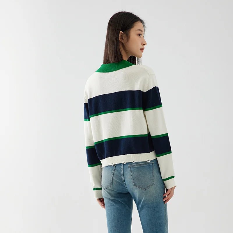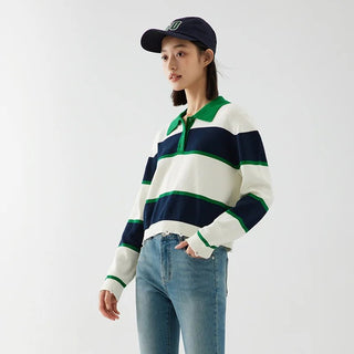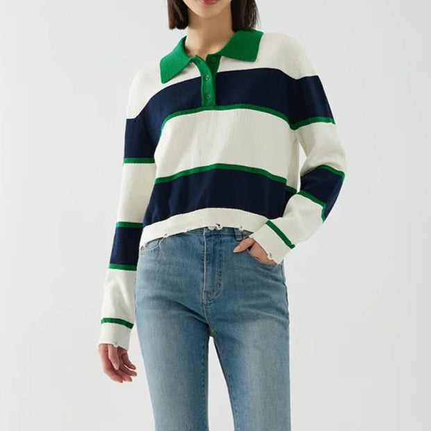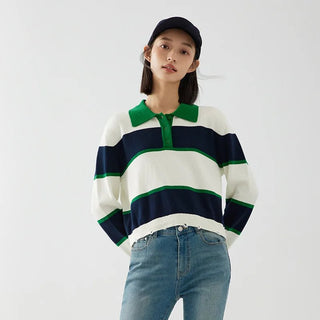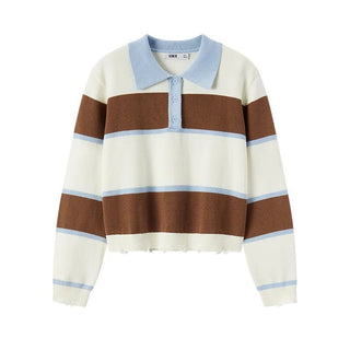 Design: A casual striped polo shirt featuring a turn-down collar, button decoration, and a single-breasted closure for a classic yet relaxed look.