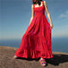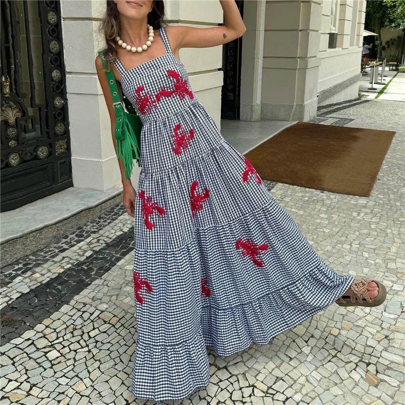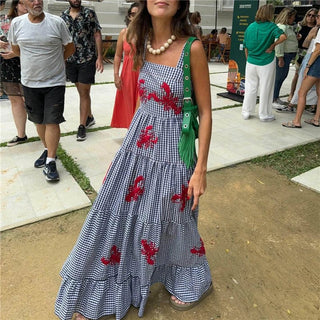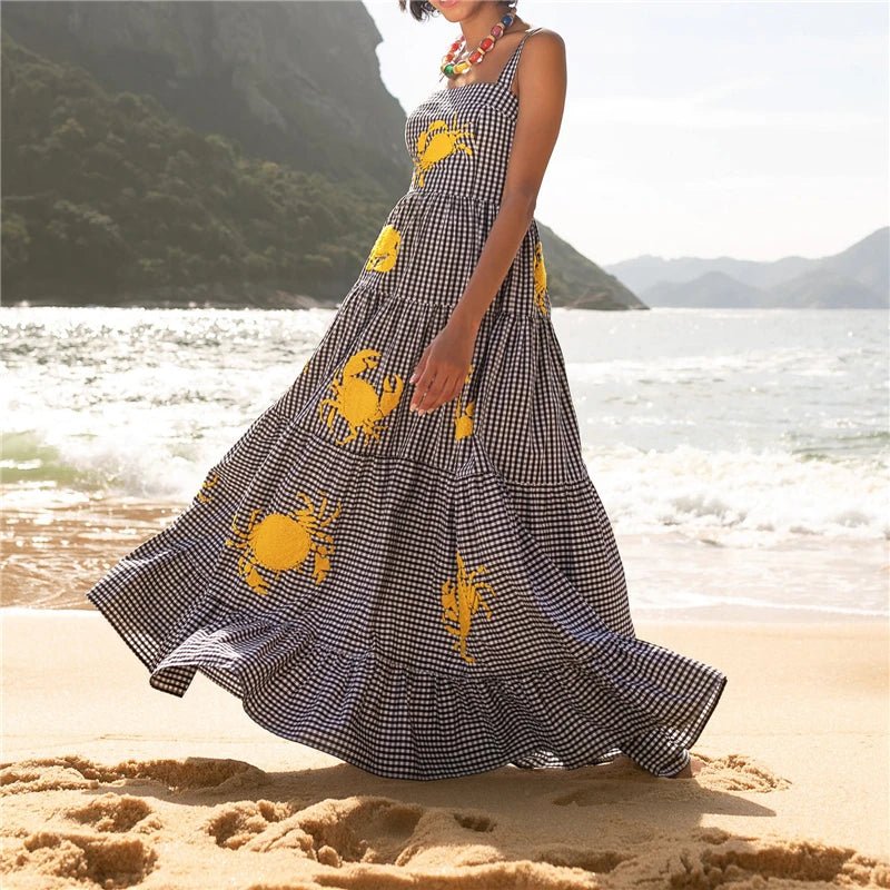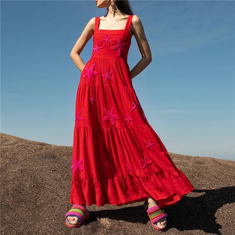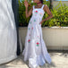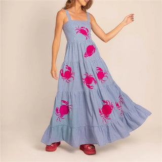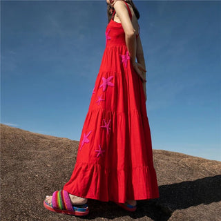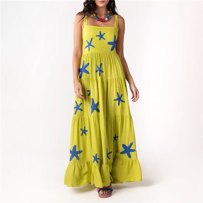 Design: A stylish sleeveless A-line dress featuring delicate embroidery, a slash neckline, and spaghetti straps. The ankle-length silhouette offers a breezy, elegant look, perfect for warm weather.