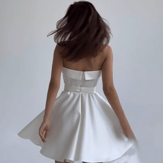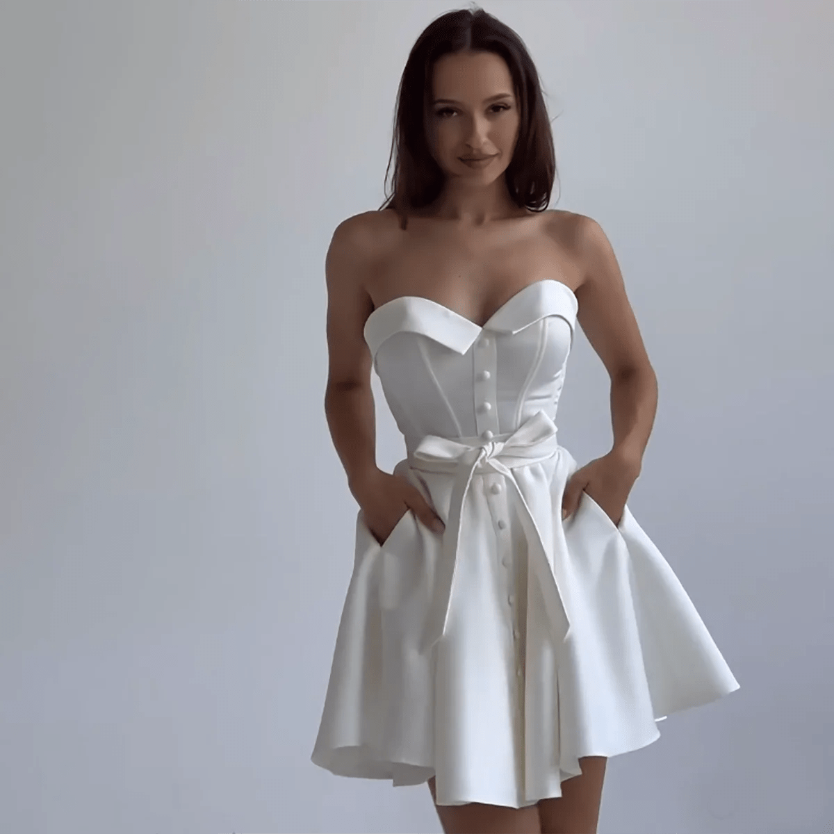 Design: A simple satin mini bridal dress featuring a sweetheart neckline, sleeveless design, and functional pockets. The bow and button details add a touch of elegance, while the A-line silhouette offers a flattering shape.