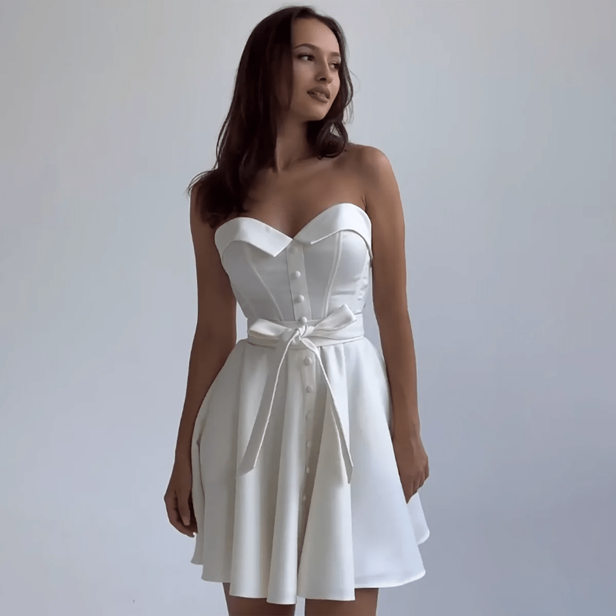 Length: Above-the-knee mini length, perfect for a chic and modern bridal look.