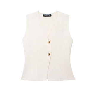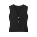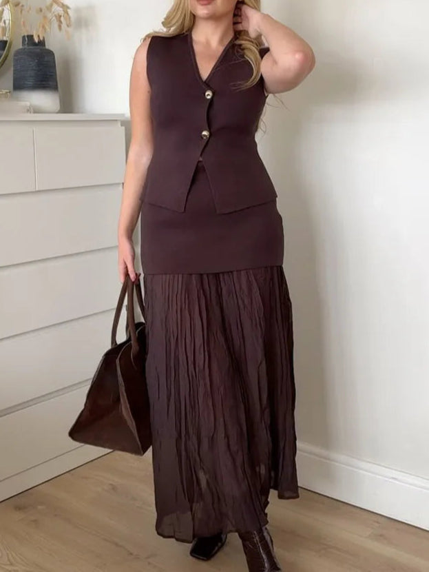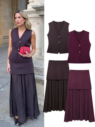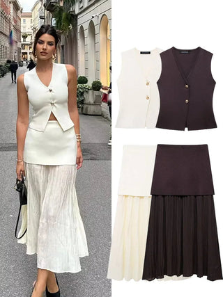 Design: A stylish V-neck sleeveless knitted vest paired with a high-waist skirt, creating a chic holiday suit. The ankle-length skirt features a loose silhouette, adding comfort and sophistication, while the button decoration on the vest elevates the overall look.