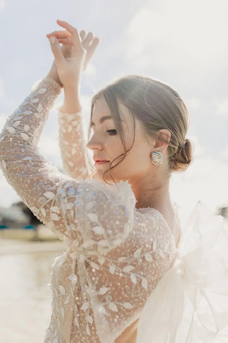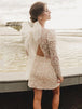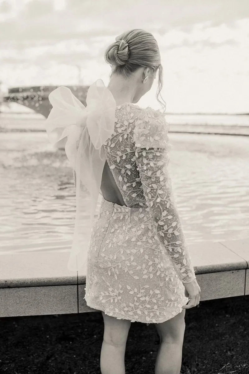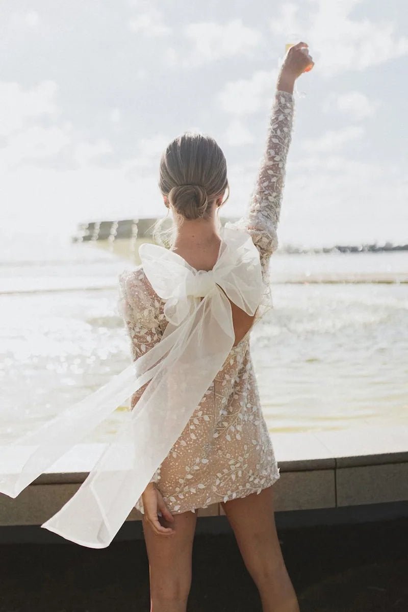 Design: A beautiful boho-inspired mini beach wedding dress featuring a flattering V-neckline and full sleeves. The lace fabric adds a touch of vintage charm, while beading and bow decorations create a playful, romantic vibe. With a backless design and a natural waistline, this dress is perfect for a laid-back, yet elegant beach wedding.