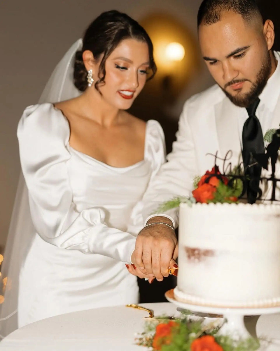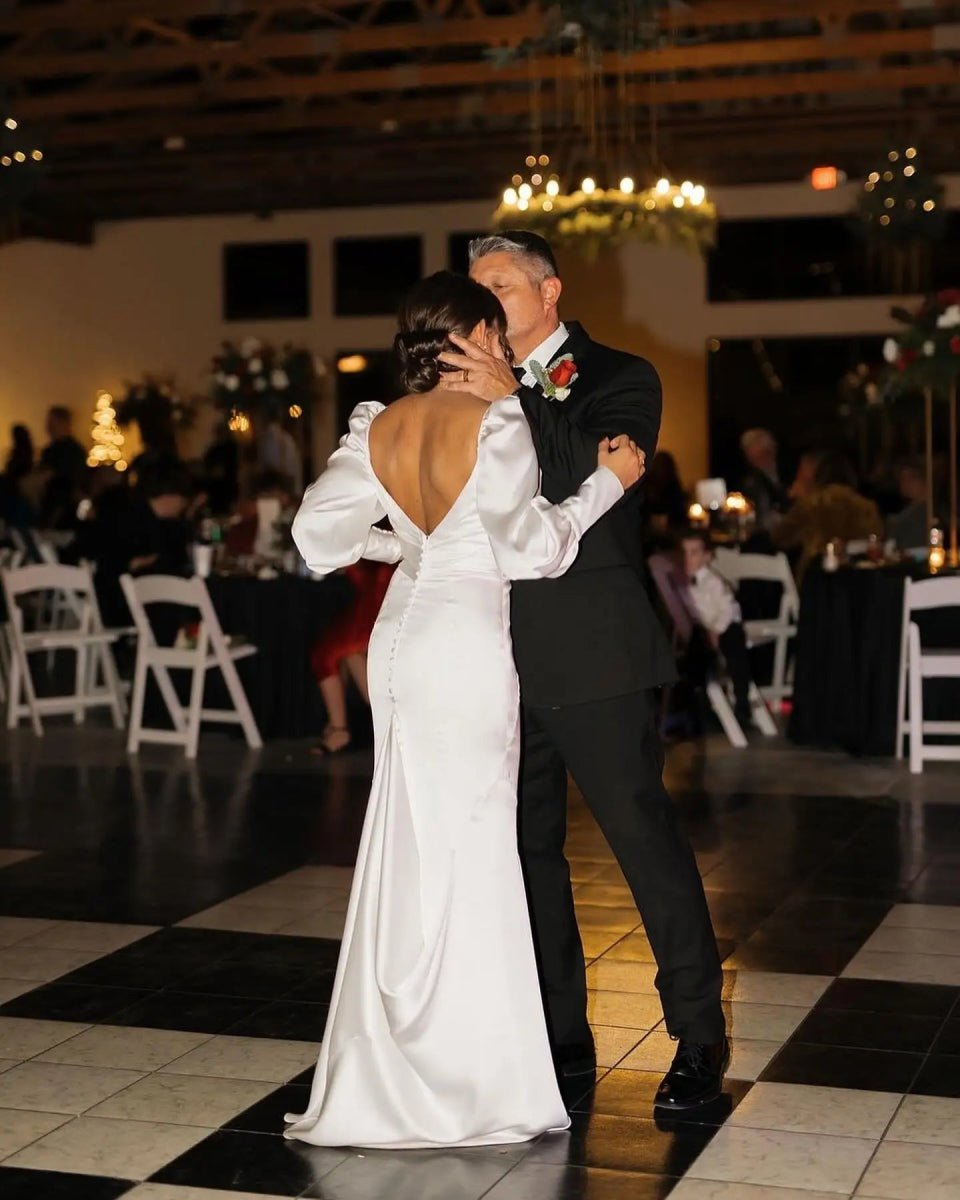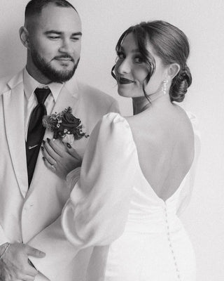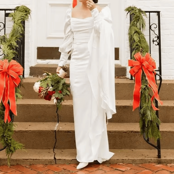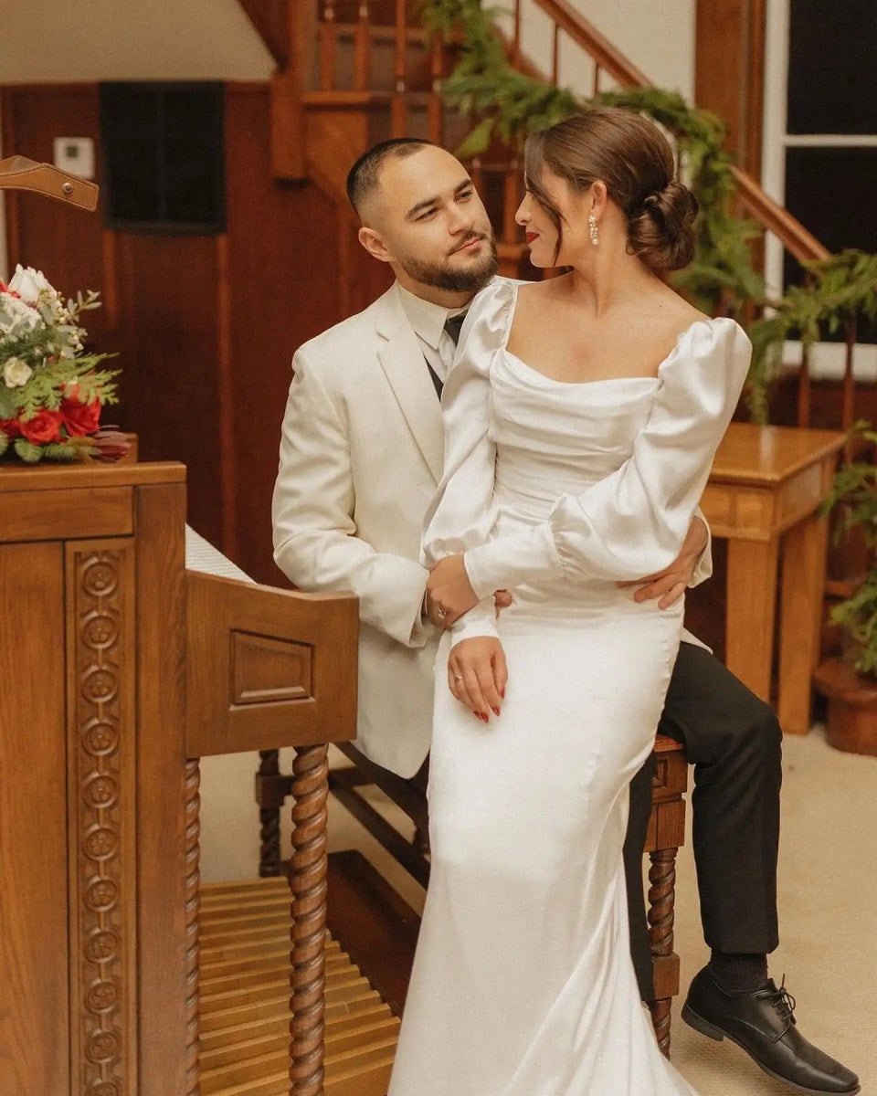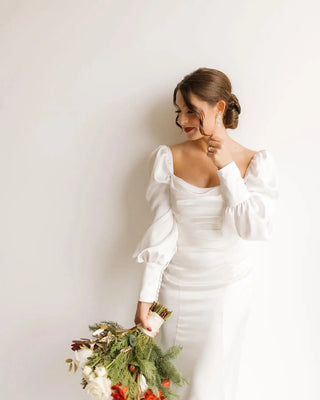 Sophisticated column wedding dress featuring a vintage square neckline, long puff sleeves, and backless design. Crafted from lustrous satin with ruched details and a sweep train, this floor-length gown offers a built-in bra for a comfortable fit. Customizable for a perfect, timeless bridal look.