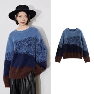 Design: A stylish Gradient Round Neck Sweater featuring a contemporary striped gradient pattern and a classic O-neck collar. The loose, relaxed fit adds a cozy yet chic touch to your wardrobe, making it perfect for layering during colder months.