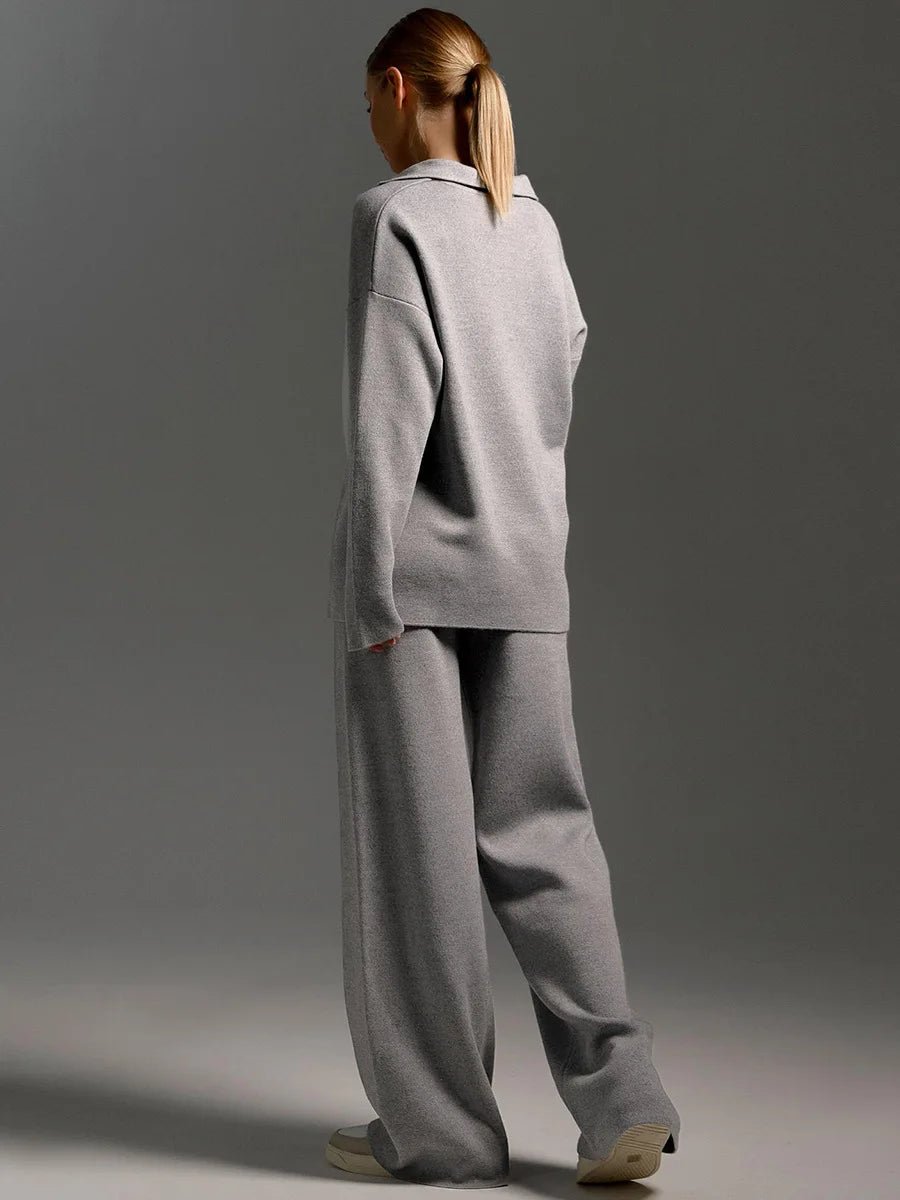 Women’s Thick Knitted 2-Piece Suit – Polo Neck Sweater & Wide-Leg Pants