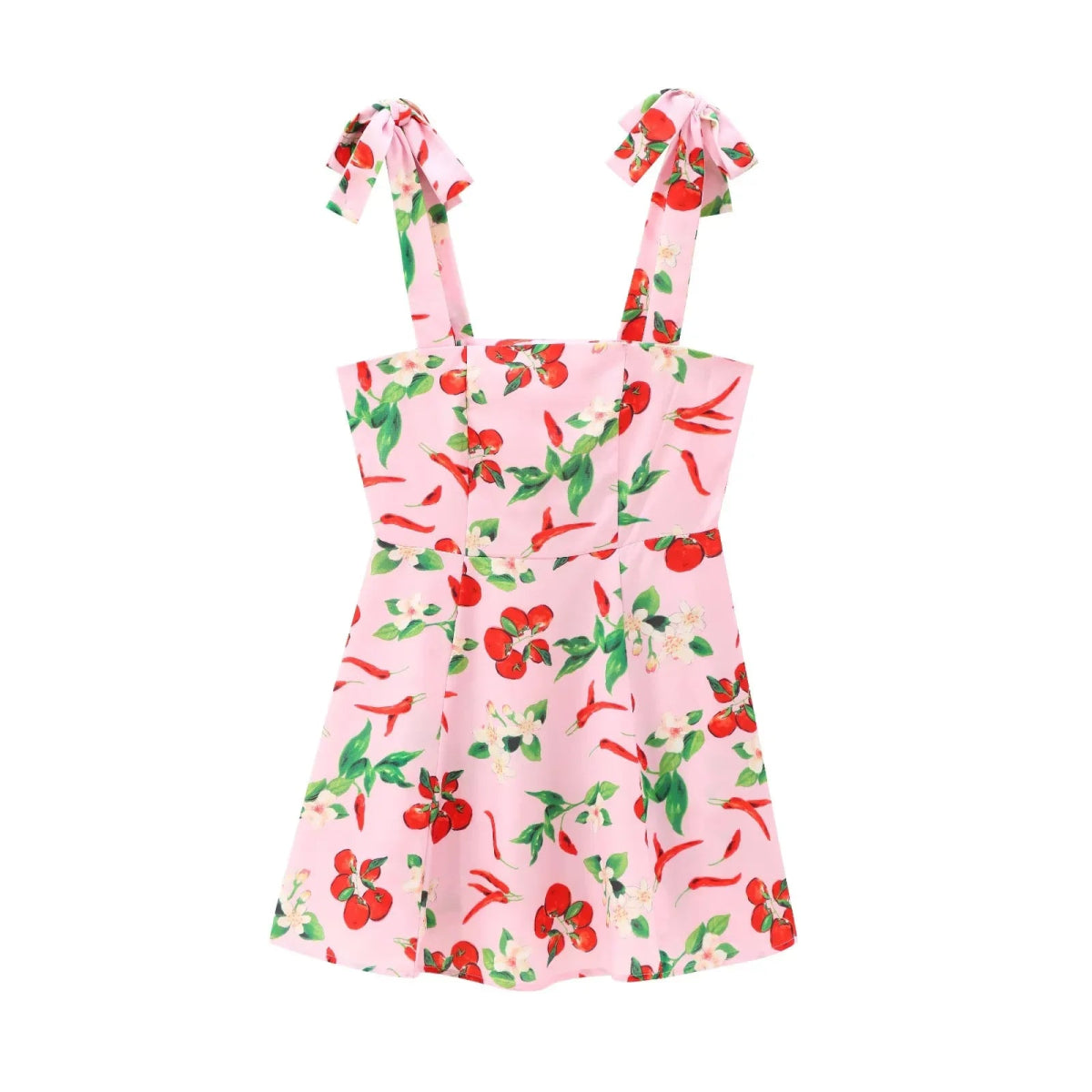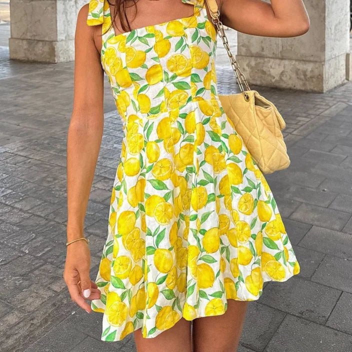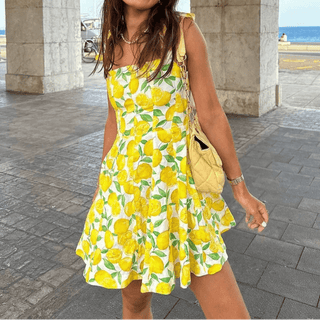 Design: Bright and breezy yellow mini dress featuring a playful fruit print, spaghetti straps, and a stylish backless design. Highlights include a flattering square neckline, charming bow detail, and convenient zipper closure.