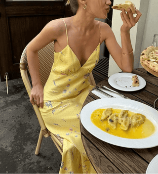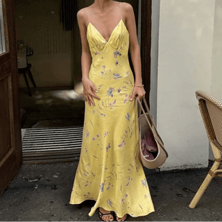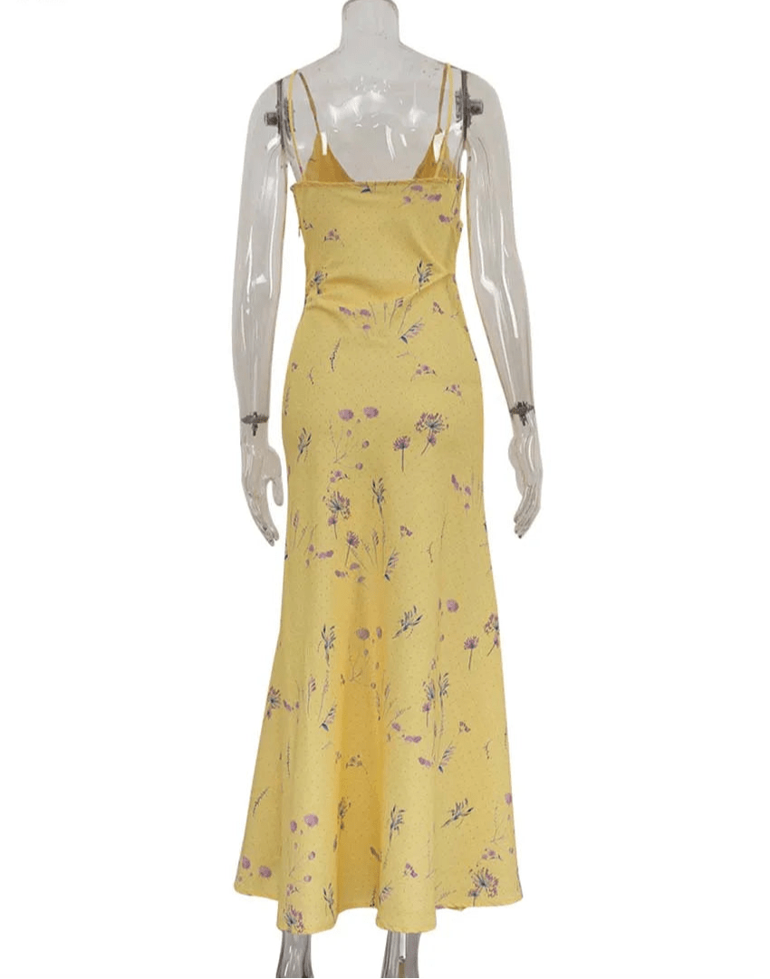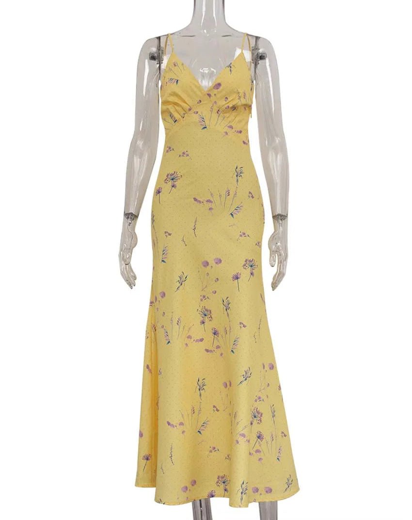 Design: A vibrant yellow ankle-length dress featuring a bold print design, slim fit, and flattering V-neckline. Delicate spaghetti straps and a straight silhouette give it a breezy yet elegant touch for effortless autumn style.